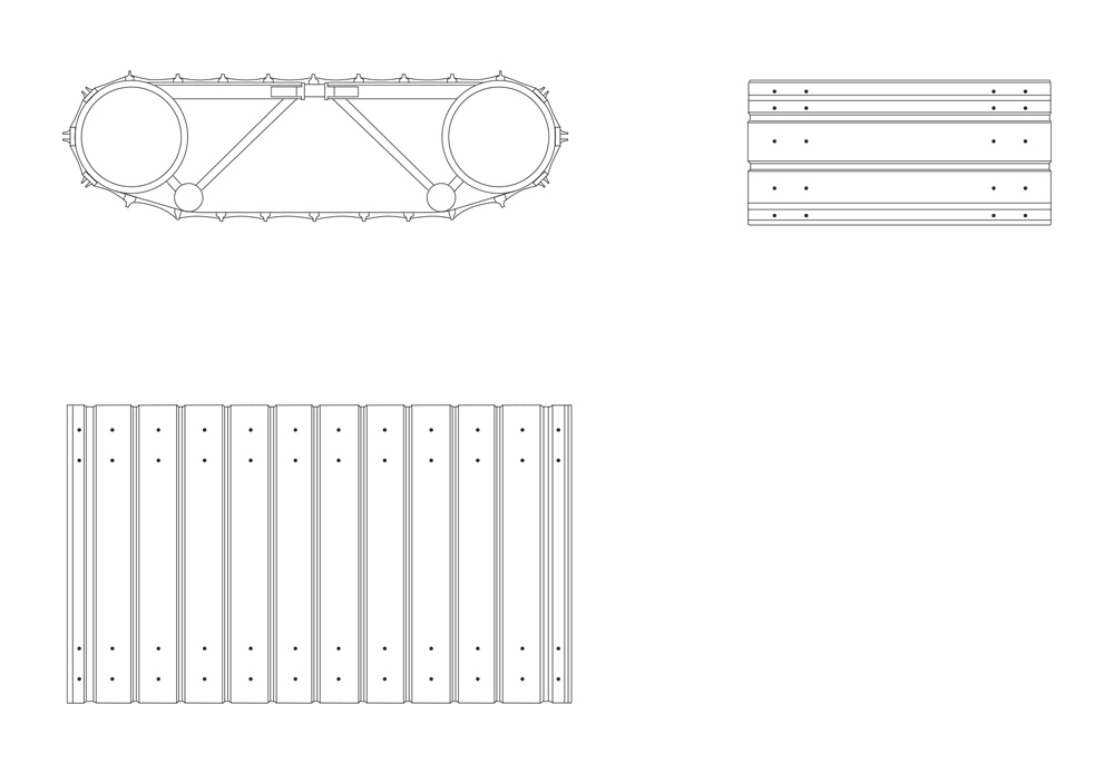 fasce esterne in profili di alluminio snodati e collegati a due cinghie in gomma naturale,